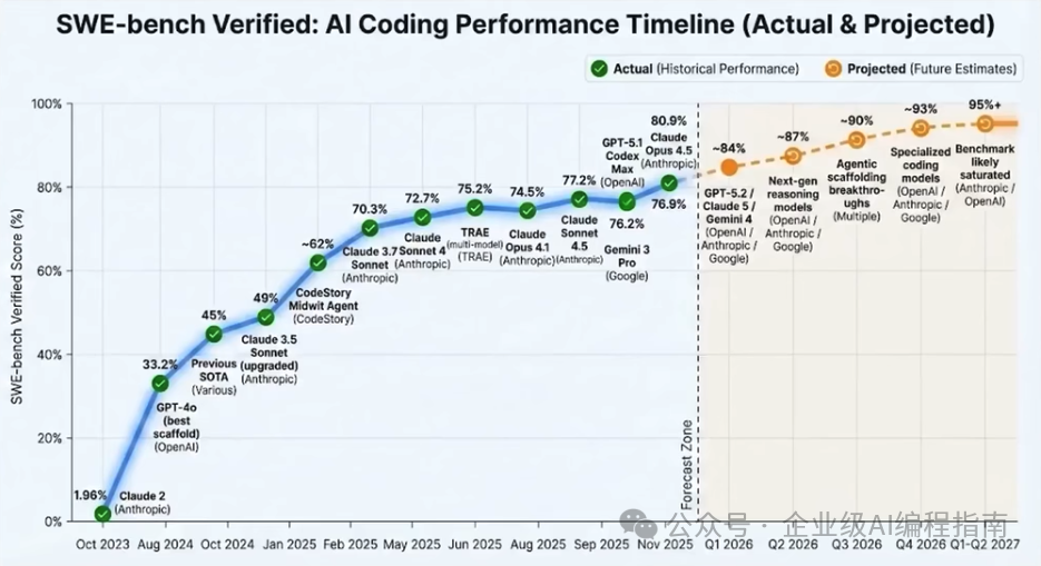 还有就是B 站的一个视频,关于 SWE-Bench发展趋势的图,虽然 SWE-Bench不能代表编码的能力,但已经能说明一些问题