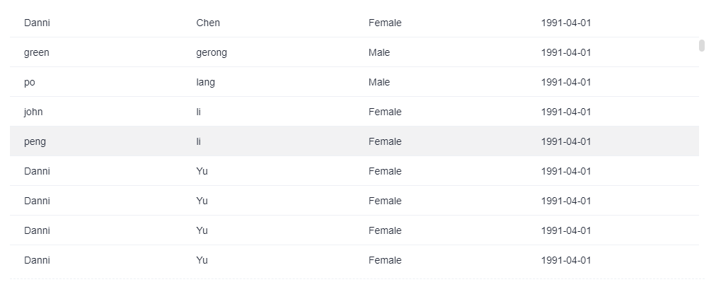 在上述代码中,使用virtualScroll启用虚拟滚动,行高须确定且相同,如果行高高于默认的40px,须配置virtualItemSize 若初始状态无数据,需要对class为cdk-virtual-scroll-viewport的元素设定高度,并且建议对d-data-table元素和noResult模板设定定位。