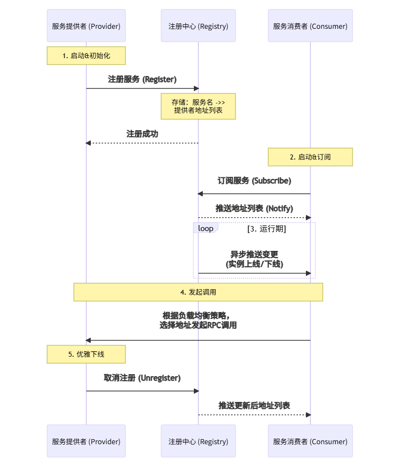 - 调用时 :根据本地缓存的地址列表,结合负载均衡策略(如随机、轮询),选择一个提供者发起RPC调用。
