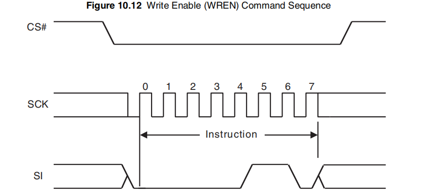在指令字节的第八位被锁存在SI后,CS必须驱动到逻辑高电平状态。如果在指令字节的第八位被锁存在SI后,CS没有被驱动到逻辑高电平状态,写入使能操作将不会执行。