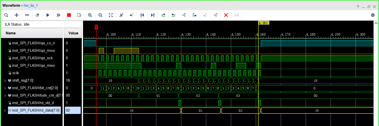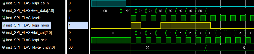 使用ILA捕获数据如下,观察到主机在sclk上升沿将RDID命令(9Fh)移位输出,flash在spi_sclk上升沿对mosi进行采样: