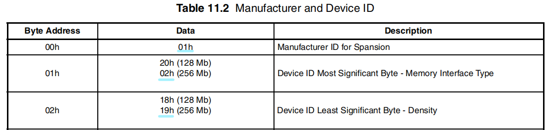 设备ID如下表所示,S25FL256S的ID号为0x010219: