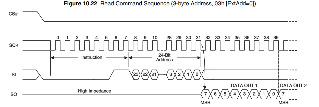 - 所有指令、地址和模式位都以最高有效位(MSb)优先的方式移入设备。数据位在移入和移出设备时也以 MSb 优先。所有数据以字节为单位进行传输,先发送最低地址字节。随后字节的数据按从低到高字节地址顺序发送,即字节地址递增。