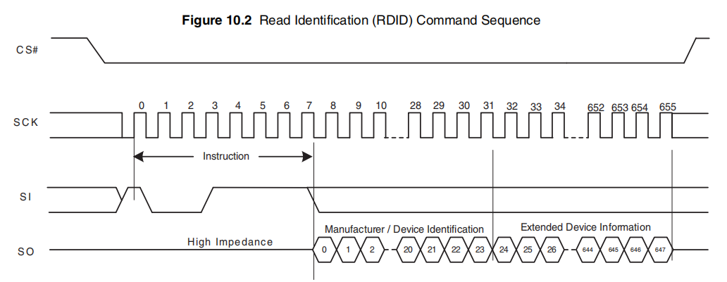 RDID完整传输过程如下,可以看到主机获得了来自flash的三个读数据01、02、19,RDID指令成功执行。