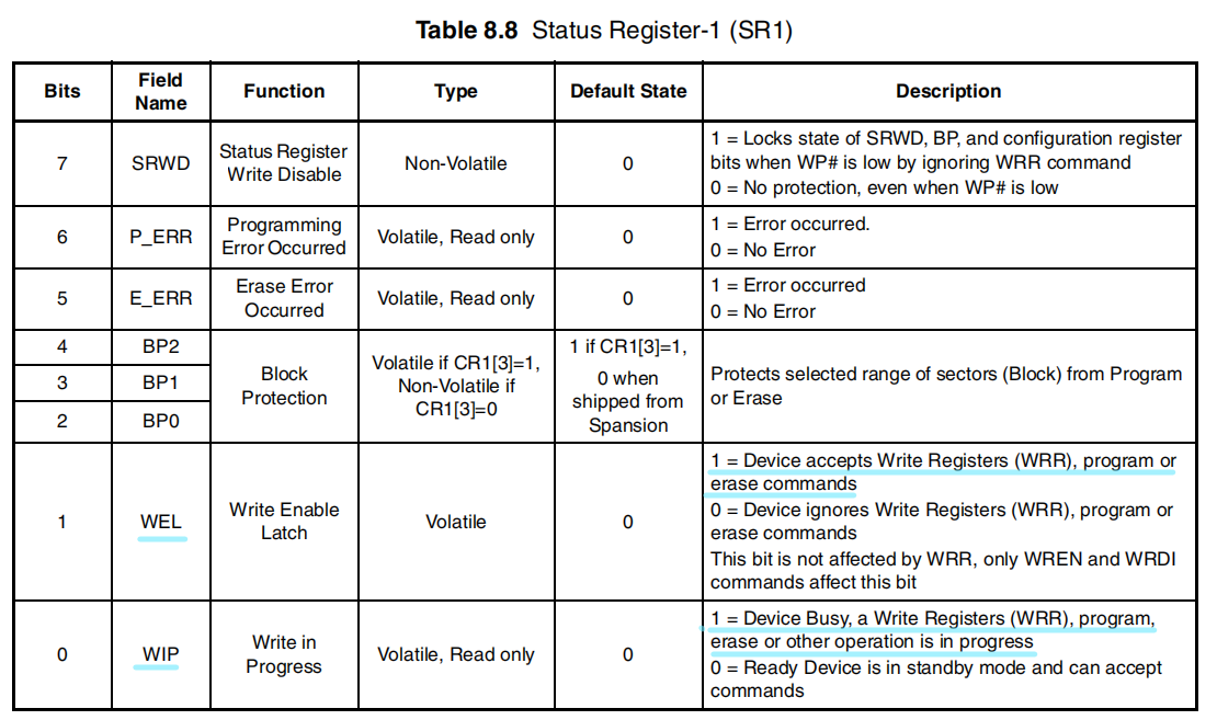 写使能锁存器(WEL)SR1[1]: WEL 位必须设置为1才能启用编程、写入或擦除操作,以防止内存或寄存器值被意外更改。执行写使能(WREN)命令会将写使能锁存器设置为 1,允许后续执行任何编程、擦除或写入命令。使用写禁用(WRDI)命令可以将写使能锁存器设置为 0,阻止所有编程、擦除和写入命令的执行。在任何成功的编程、写入或擦除操作结束后, WEL 位会被清零。如果操作失败, WEL 位可能保持设置,应在执行 CLSR 命令后使用 WRDI 命令将其清零。在电源关闭/重新启动、硬件复位或软件复位后,写使能锁存器会被设置为 0。 WRR 命令不会影响此位。