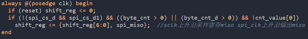shift_reg <= {shift_reg[6:0], spi_miso}; //sclk上升沿采样寄存miso spi_clk上升沿输出miso