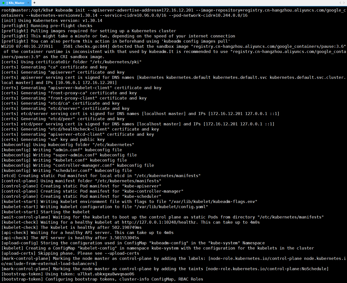 kubeadm init --apiserver-advertise-address=172.16.12.201 --image-repository=registry.cn-hangzhou.aliyuncs.com/google_containers --kubernetes-version=v1.30.14 --service-cidr=10.96.0.0/16 --pod-network-cidr=10.244.0.0/16