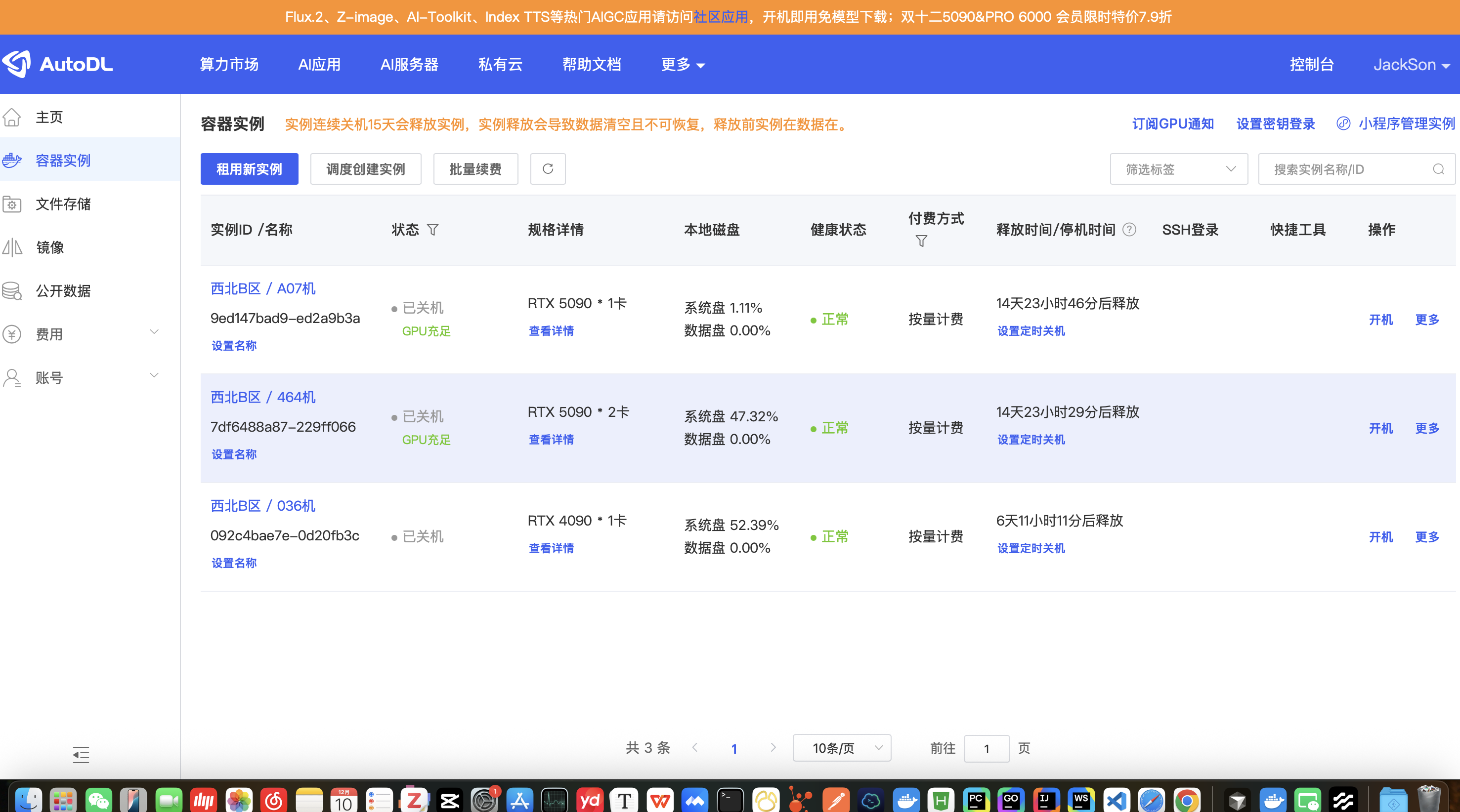 - 进入「算力市场」,筛选GPU型号:优先选「A100-PCIE-40GB」或「RTX 5090-32GB」;