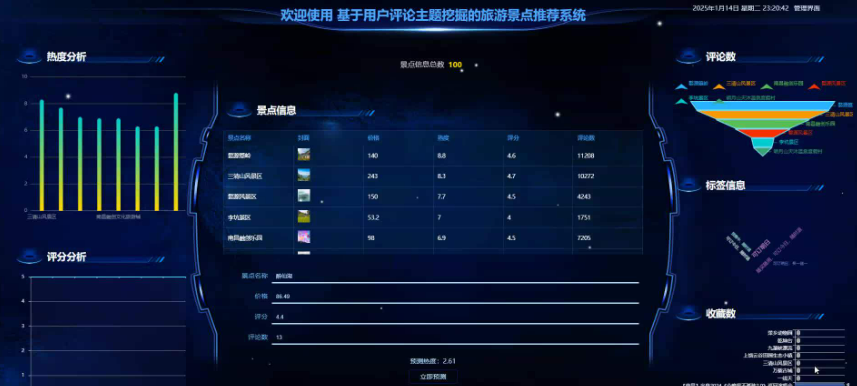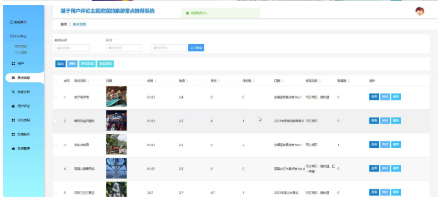 数据驱动决策:通过对大量的景点数据和用户评论进行分析,系统能够挖掘出有价值的信息,为管理员提供数据支持,帮助其优化景点管理和营销策略。