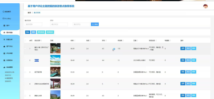 个性化推荐:基于用户评论挖掘结果和景点属性,系统为每位用户生成个性化的旅游推荐方案。这有效解决了传统旅游信息服务中信息过载和推荐精准度不足的问题。
