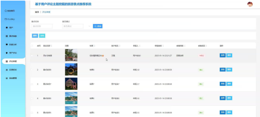 社区互动与举报:普通用户可以发表个人旅游体验,查看其他用户的真实评价,同时参与社区互动和举报不当评论。这增强了系统的互动性和社区感。