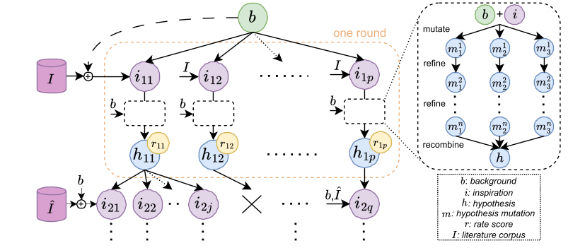 该图描绘了一个迭代过程,包含多个轮次,用于从文献中生成和优化科学假设: