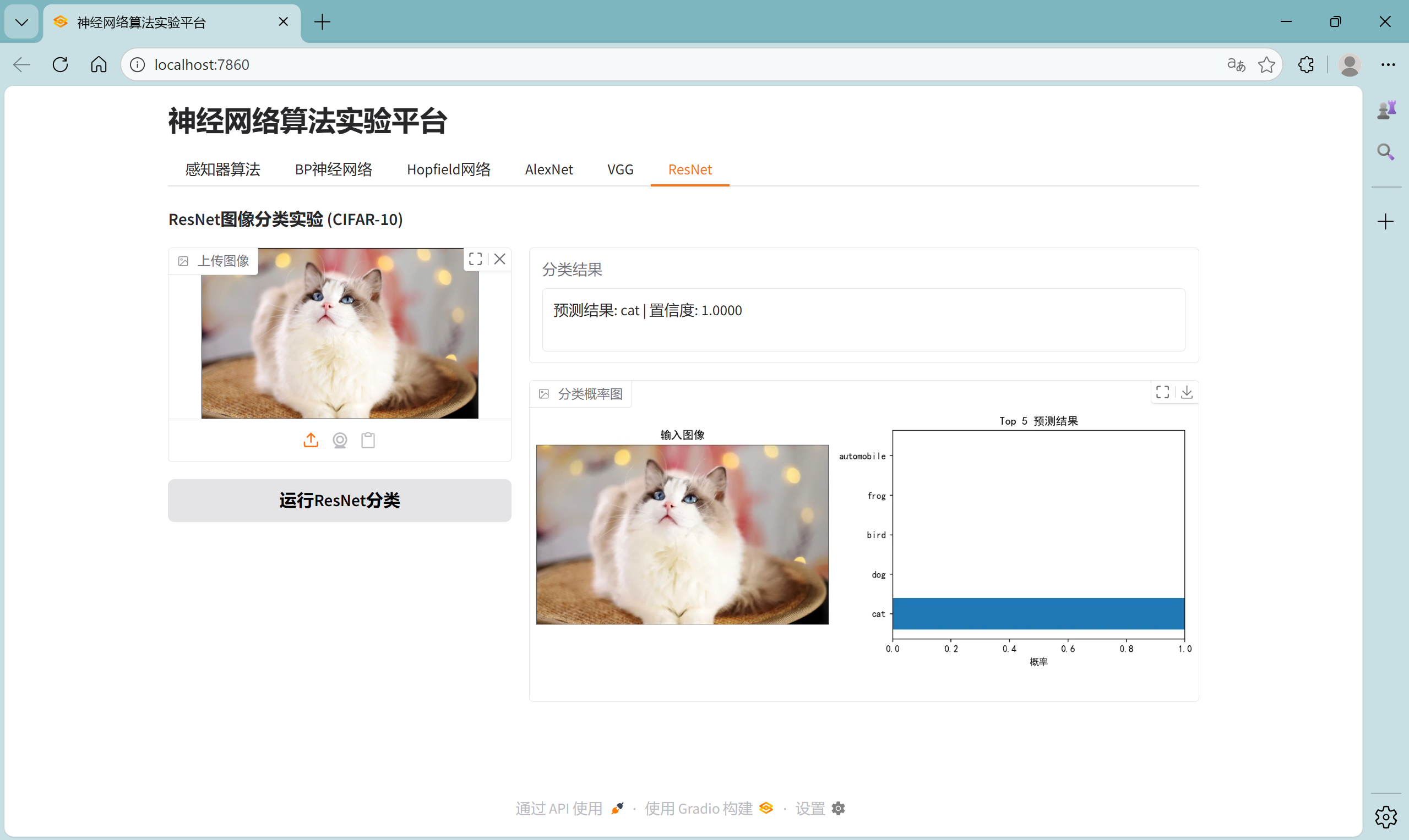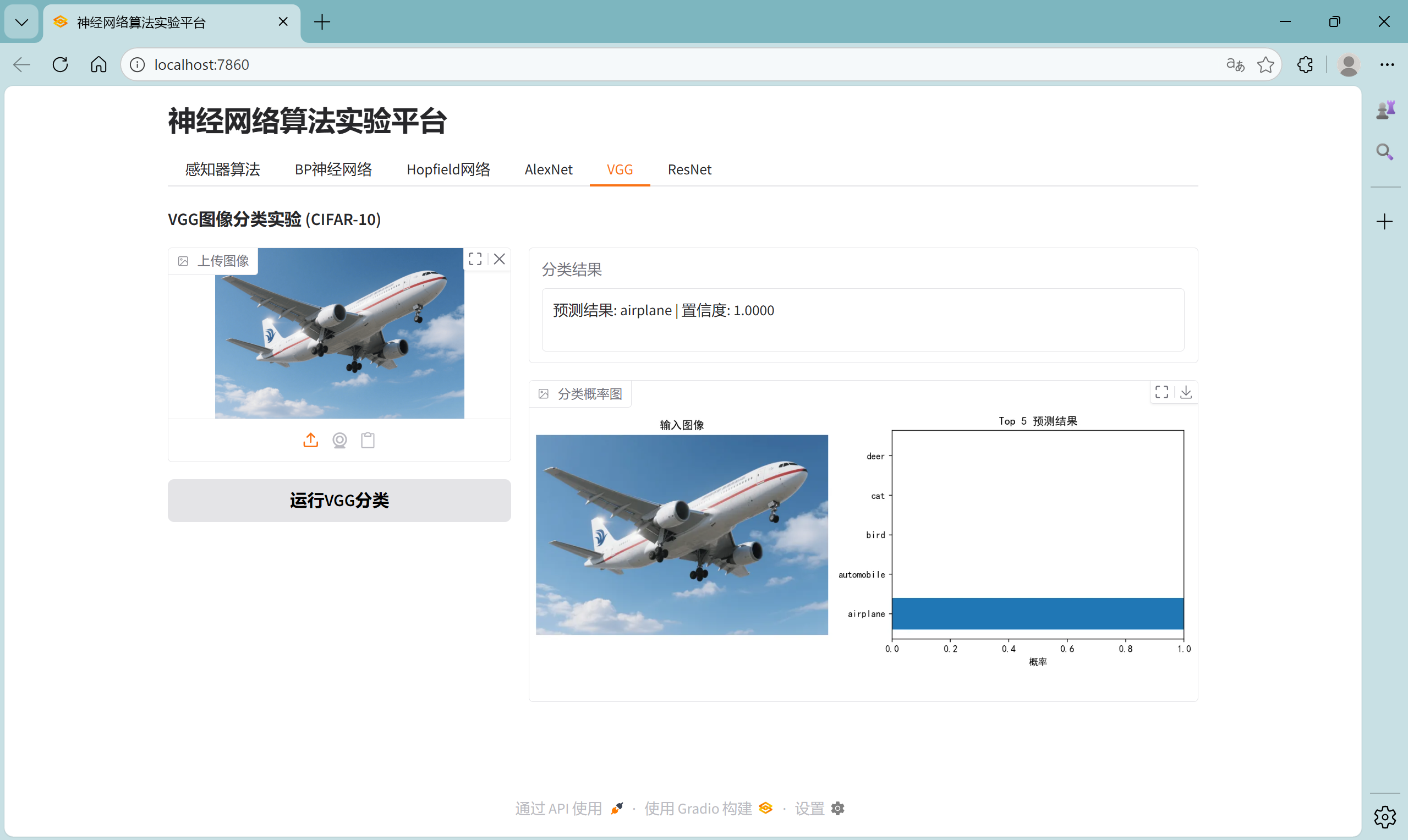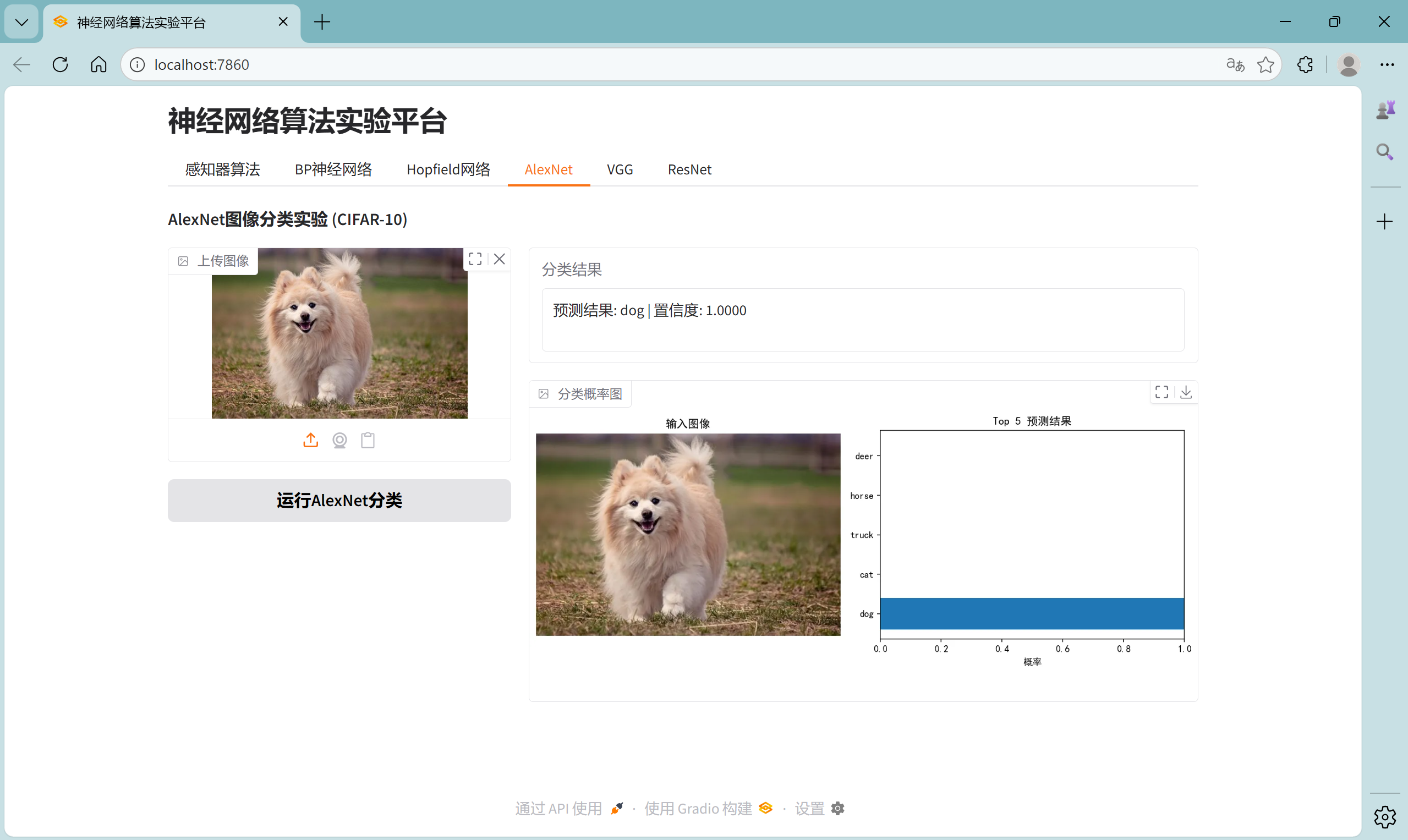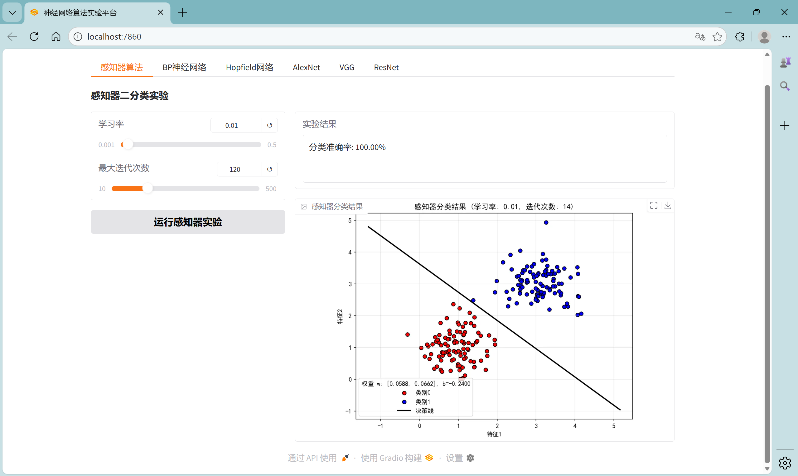 神经网络实验往往需要编写大量代码、调试参数、手动可视化结果,对于初学者而言门槛较高。传统的命令行式实验方式不仅操作繁琐,还难以直观展示算法效果。本文基于Gradio 框架,构建了一个集经典神经网络(感知器、BP、Hopfield) 和深度学习模型(AlexNet/VGG/ResNet) 于一体的可视化 GUI 实验平台,无需编写代码,仅通过界面交互即可完成各类神经网络实验,大幅降低了实验门槛。