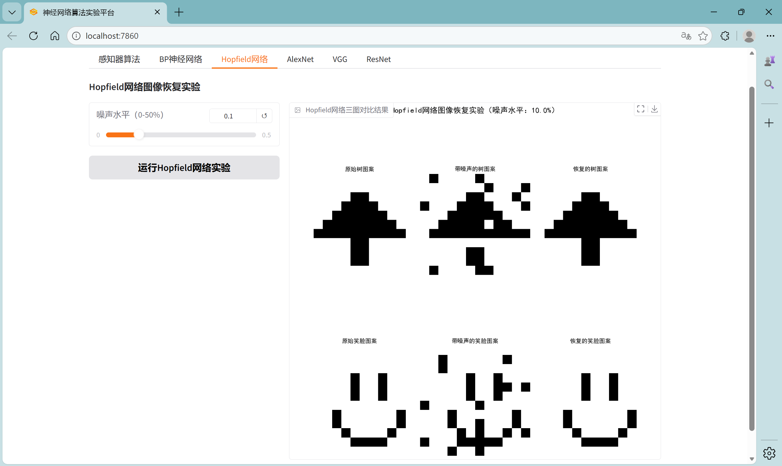 | Hopfield 网络 | 图像恢复实验,支持调节噪声水平 | 噪声滑块 | 原图 / 带噪声图 / 恢复图 |