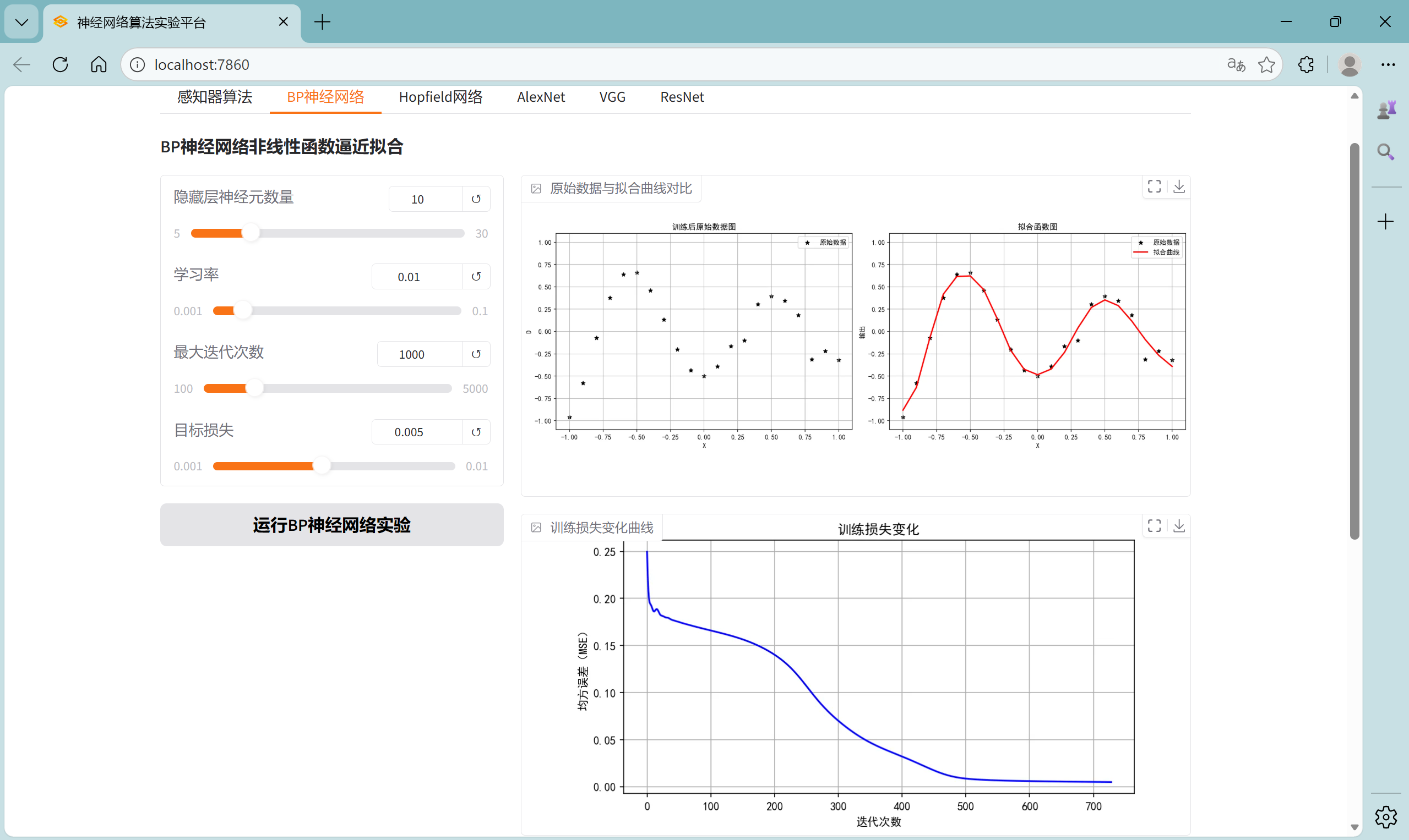 | BP 神经网络 | 非线性函数拟合,支持调节隐藏层神经元数、学习率、迭代次数、目标损失 | 多滑块参数调节 | 原始数据 / 拟合曲线对比、损失下降曲线、网络参数 |