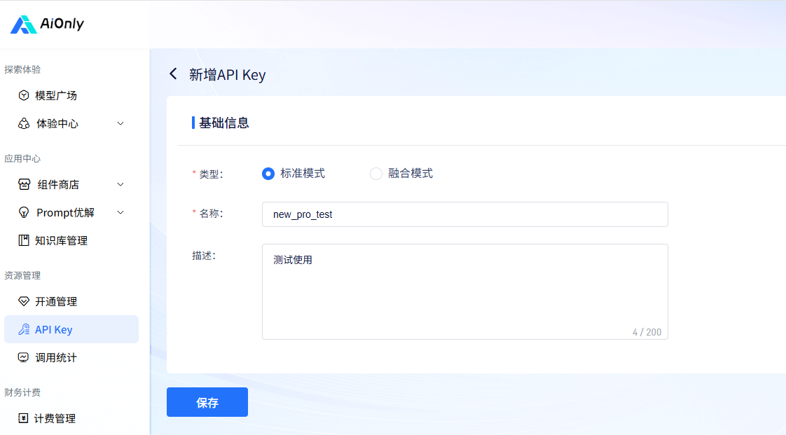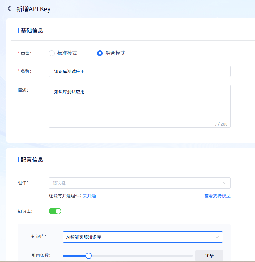 - 一个 API Key 可调用多种模型,支持 "标准模式"(基础 API)与 "融合模式"(关联组件 / 知识库),分应用创建密钥便于权限管控;