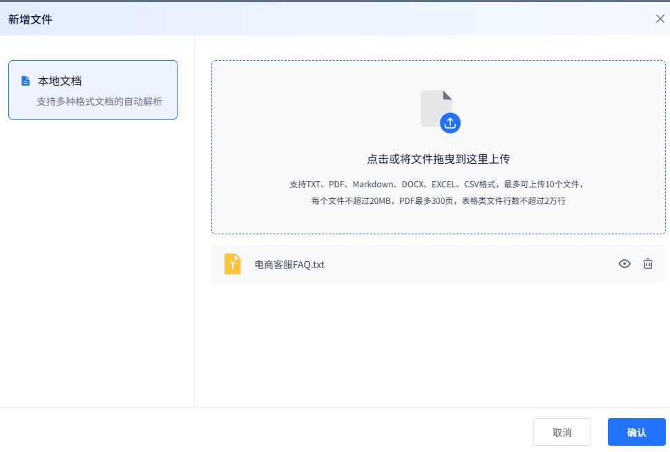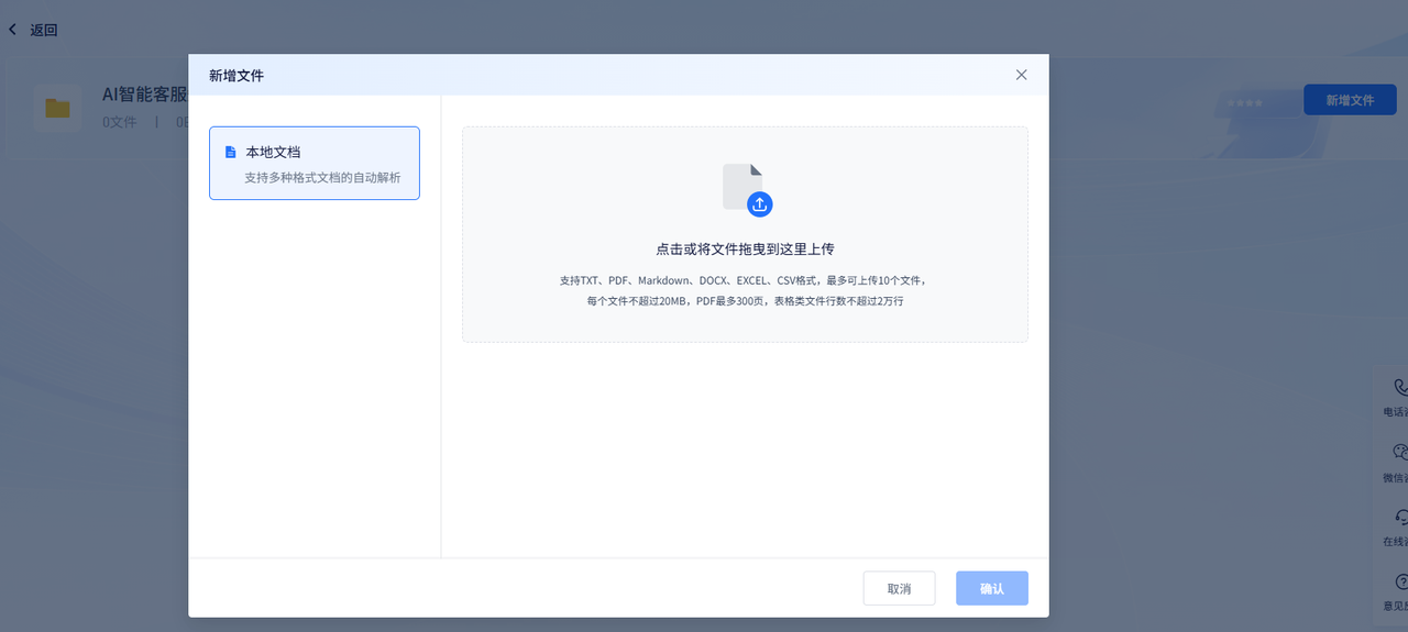支持上传文档(.md/.docx)、表格(.xlsx)、txt等,点击文档来到下面的上传页面