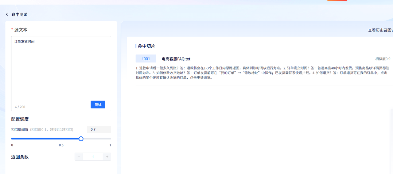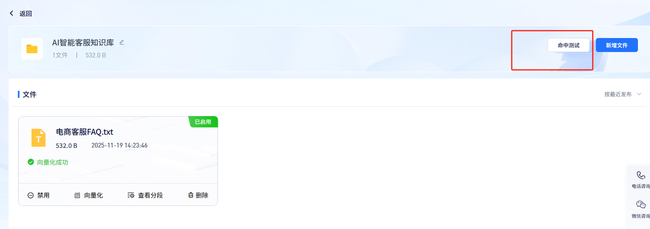 向量化完成后,可以点击右上角的命中测试,测试下向量数据库是否可以正常使用