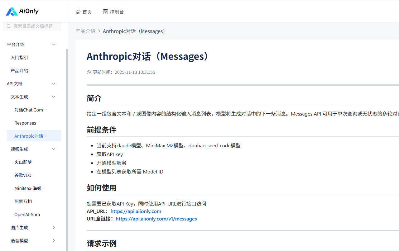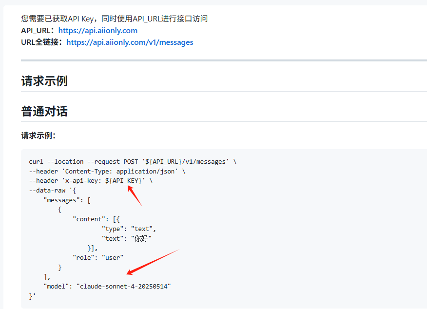 这里以Anth这个对话API为例进行说明,在示例文档中,给出了基本的调用模板,只需要替换为自己的API_KEY与对应的模型ID即可