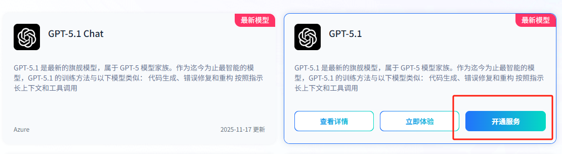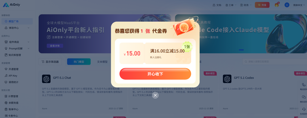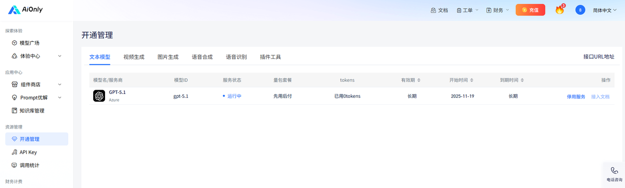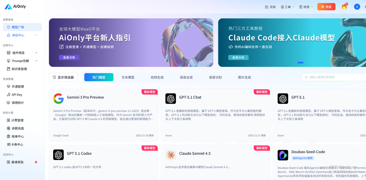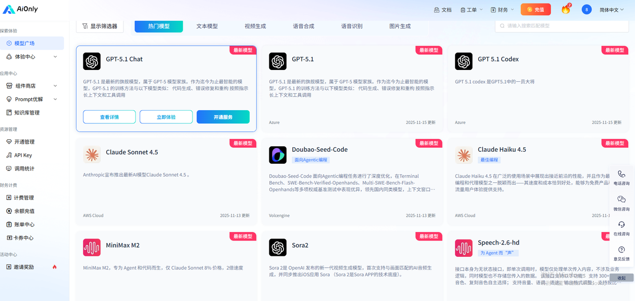 后续在自己的应用开发中,需要通过AiOnly对接各类大模型,类似于使用阿里云百炼,硅基流动那种,不过在AiOnly这边,提供了更精细的选择,即需要你先选择开通具体的模型服务,在主页模型广场中,可以看到官方提供了很多种当下热门的大模型,像GPT5,在国内直接访问是比较麻烦的,而在这里,只需要通过AiOnly开通之后即可使用