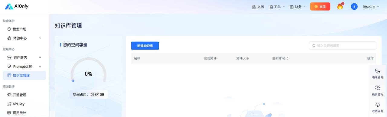 在大模型应用开发场景中,知识库可以说是必不可少的功能,基于知识库可以构建企业级自身的各类AI应用,在AiOnly中提供了知识库功能,方便使用者快速创建个人或 团队的知识库,如下,在左侧有一个知识库管理的菜单