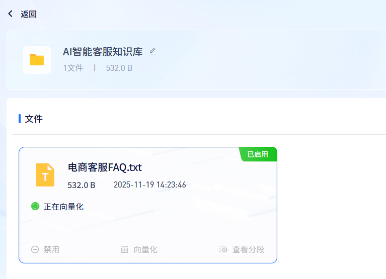 点击确认后,来到下面的页面,注意需要对文档进行向量化,否则后续无法正常使用