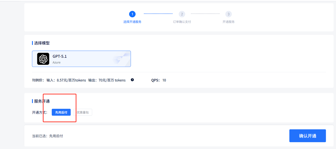 点击之后,来到下面的页面,选择先用后付,确认开通
