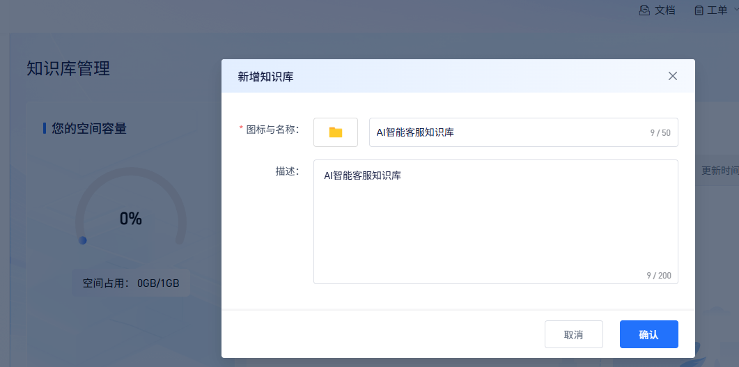 在配置信息中,知识库那里选择自己上一步创建的知识库,最后点击确认