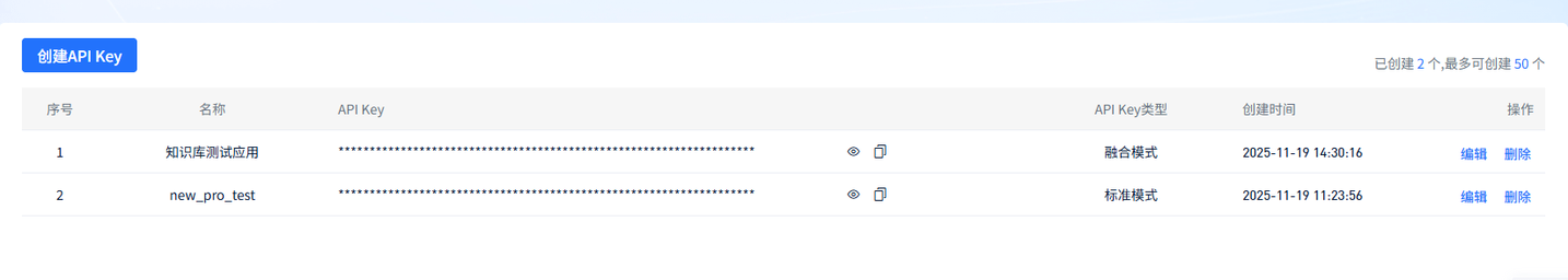 有了自己的知识库后,在后续的应用开发中,就可以接入进去了,首先需要创建一个新的apikey,注意在类型选择时使用第二个融合模式