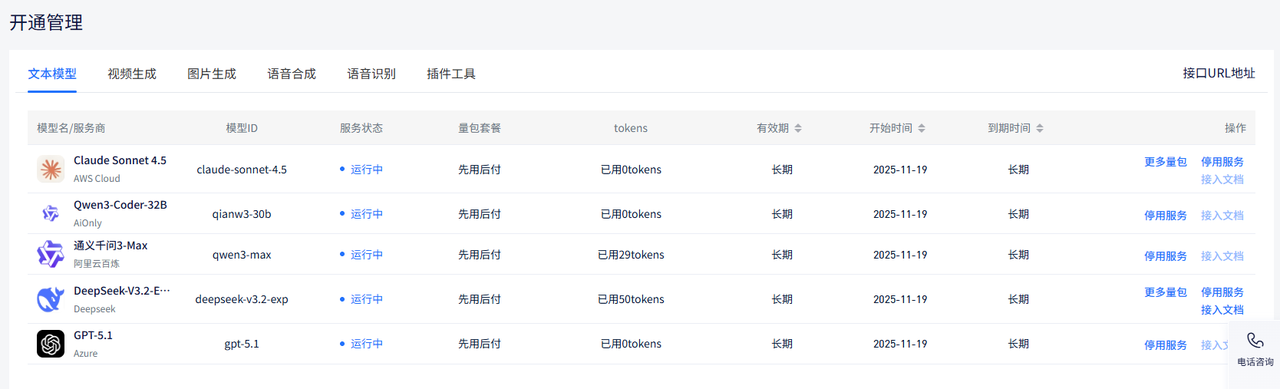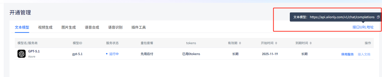 不同的TAB页,对应了大模型提供的不同服务,都有各自的API地址