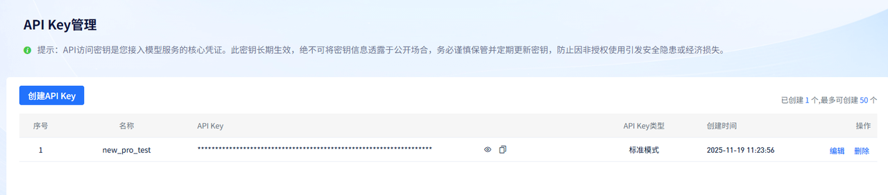 和使用其他的类似大模型对接平台类似,开通模型服务后,在后续的应用开发中,你要通过平台调用大模型的服务,一般通过apikey来调用,此处也是一样,需要先创建一个apikey,如下点击创建