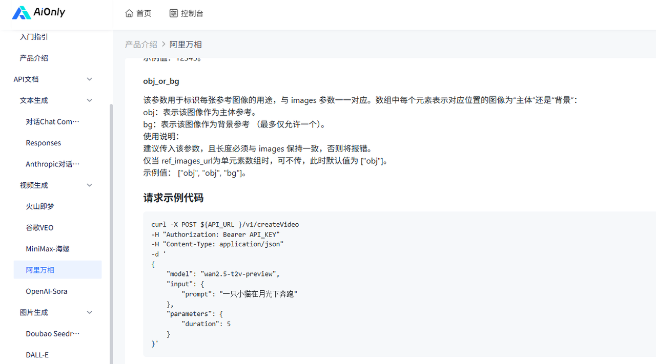 基于大模型生成视频也成为很多应用开发比较常见的场景,AiOnly通过接入其他具备生成视频的大模型,方便开发者通过应用程序调用API生成视频,如下,以通义系列的万相大模型为例,找到下面的示例代码