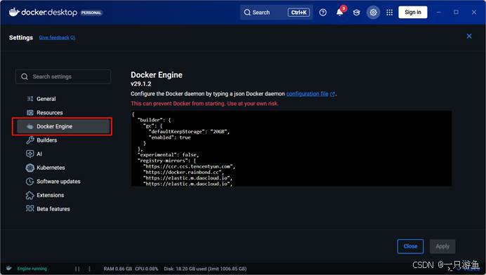 这里可能会报错,原因是网络qiang,可以打开docker设置修改镜像源: