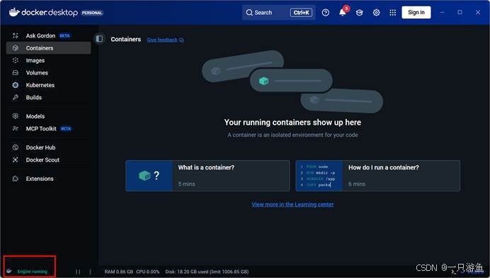 启动docker后,可以看到左下角显示:running 则表示docker正在运行