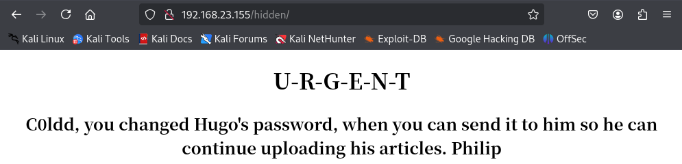 紧急通知科尔德,你修改了雨果的密码,麻烦尽快把新密码发给他,这样他才能继续上传文章。菲利普