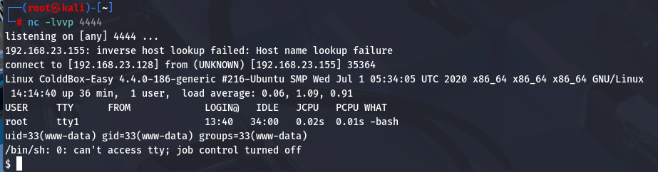 注意 kali 在触发反弹 shell 之前就需要监听 4444 端口以 getshell
