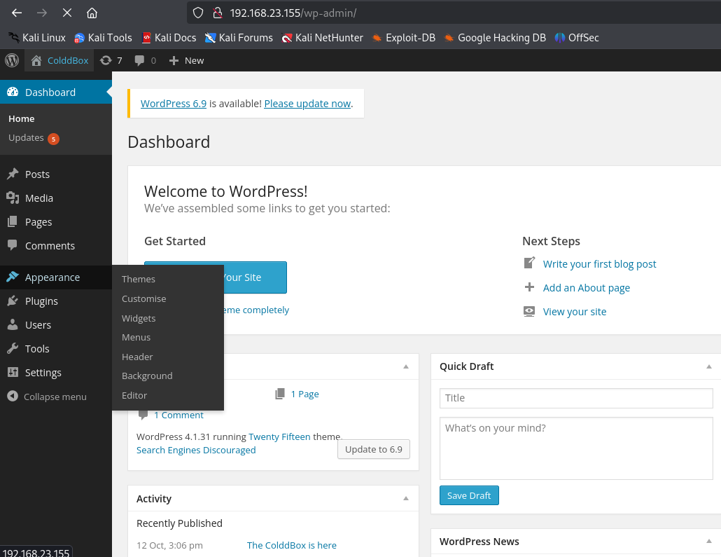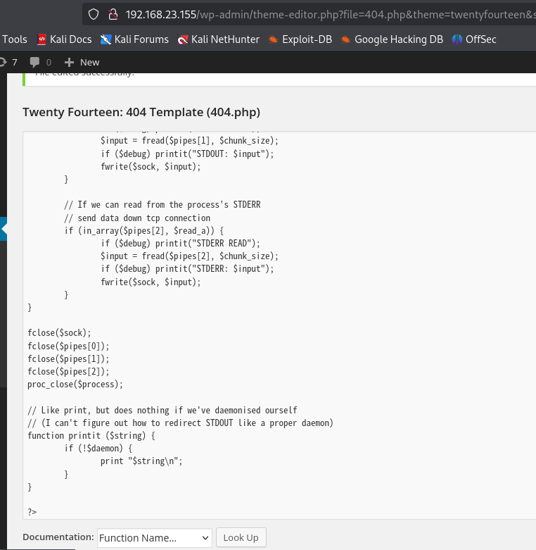 在后台对wordpress 的主题进行编辑,在下述页面黏贴 kali 自带的反弹 shell 代码