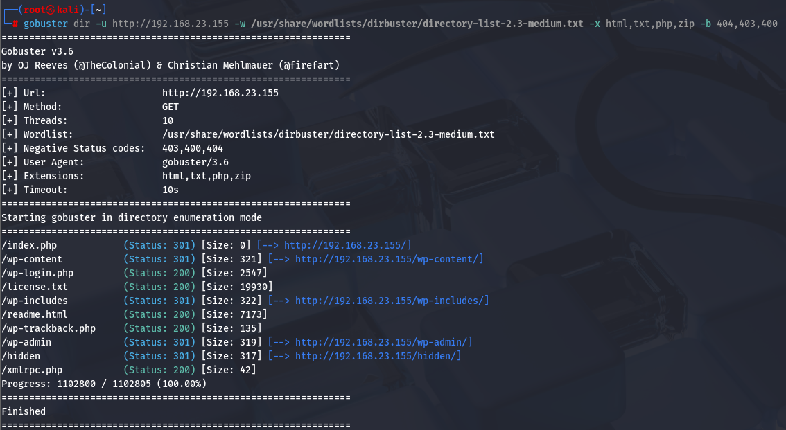 gobuster dir -u http://192.168.23.155 -w /usr/share/wordlists/dirbuster/directory-list-2.3-medium.txt -x html,txt,php,zip -b 404,403,400