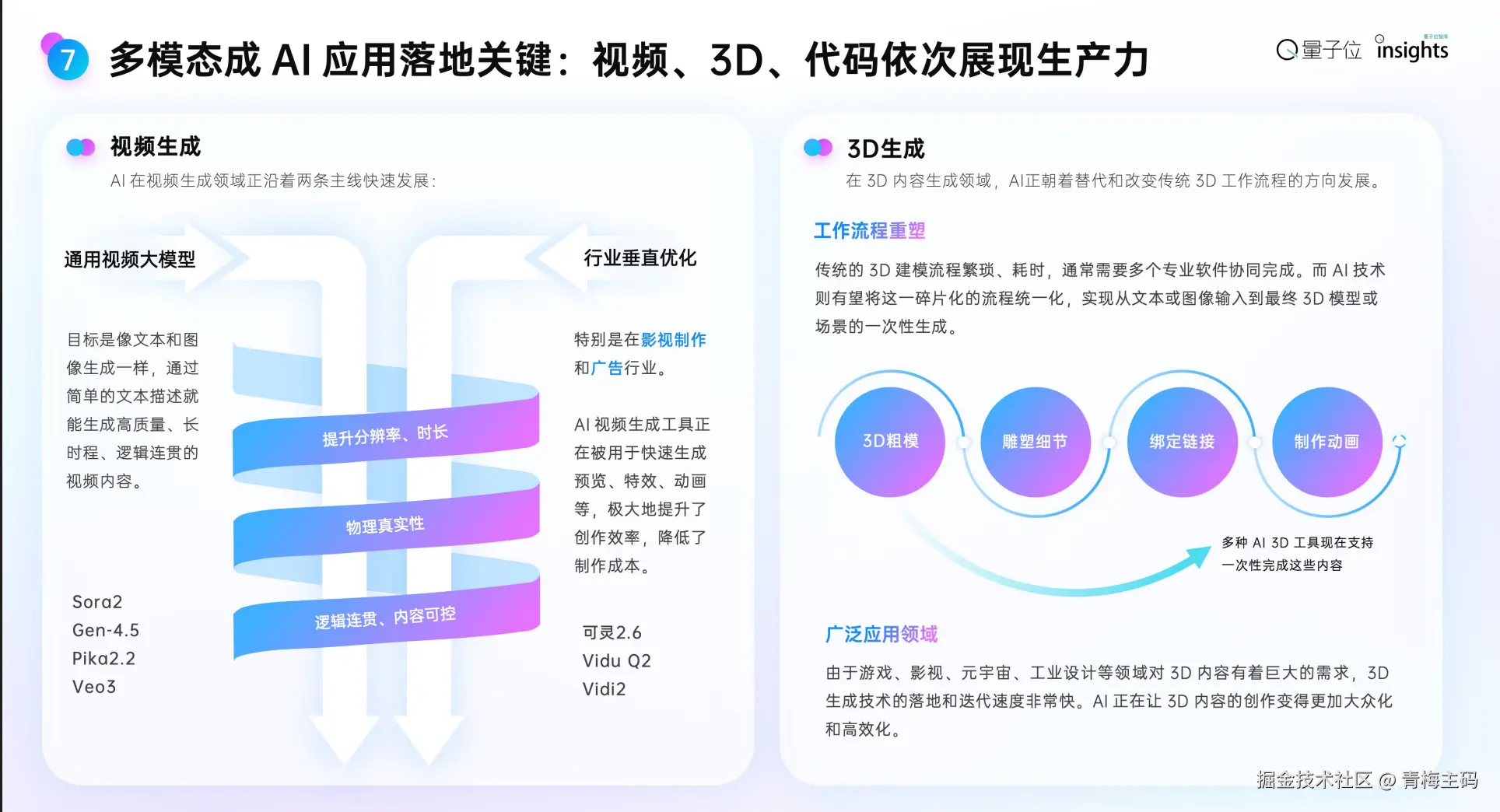 多模态融合文本、图像、视频成标配。视频生成分通用(如Sora2 )和垂直(如影视预览),提升分辨率和逻辑连贯。3D 生成重塑工作流,从文本到模型一次性搞定,助力游戏、元宇宙。代码生成跨门槛,Vibe Coding 用自然语言描述意图,AI建项目。多模态让开发者从琐事解放,专注价值创造------从"降本"到"升维"。