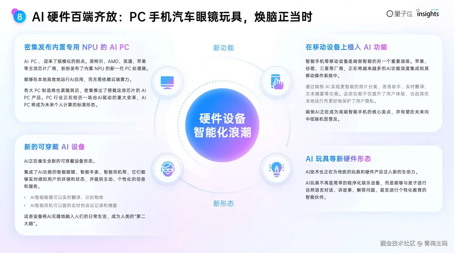 端侧AI 生态爆发。AI PC 密集发布,内置NPU 处理器如Intel 、AMD ,本地运行无需云端。手机集成照片分类、实时翻译;可穿戴如AI眼镜实时识物;玩具变智能伙伴,对话教育。优势?低延迟、高隐私。软硬件协同,构建"第二大脑"。