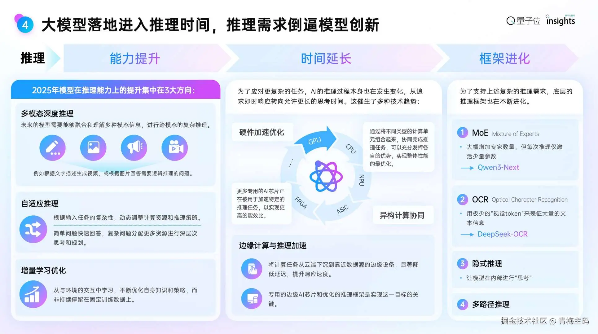 训练后是"实战"------推理阶段。2025年,多模态深度推理、自适应推理和增量学习成焦点。MoE 专家数量激增(如Qwen3-Next ),OCR 用少量token表征文本,隐式推理让模型"内部思考"。硬件异构协同和边缘加速,确保低延迟。Agent时代,任务复杂度飙升,推理框架进化成刚需。