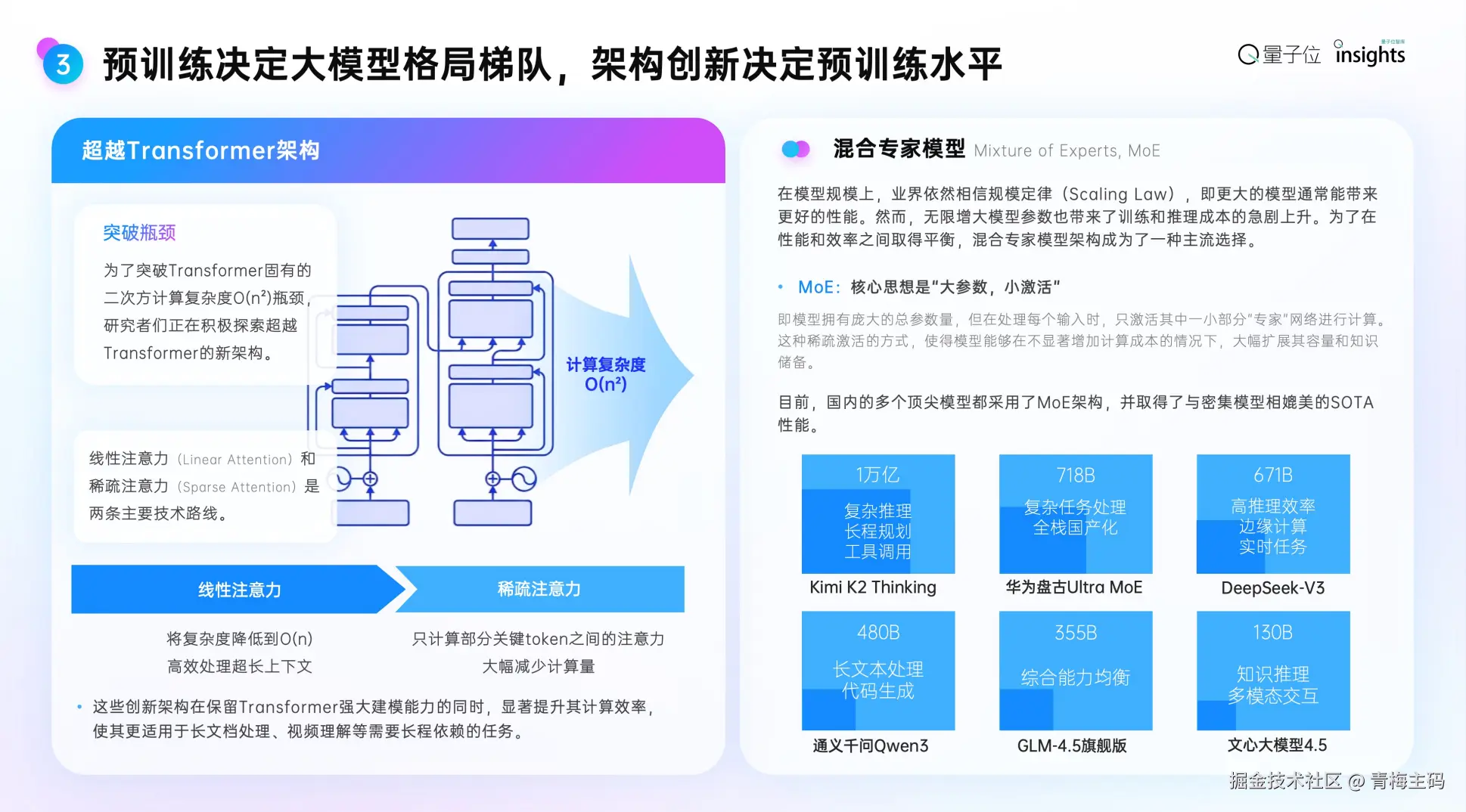 预训练是AI "上课"阶段,决定谁进梯队。超越Transformer 架构是关键,线性注意力和稀疏注意力降复杂度到O(n) ,高效处理长上下文。MoE (混合专家模型)成主流:"大参数,小激活",如总参数1万亿 的Kimi K2 Thinking ,专注复杂推理。
