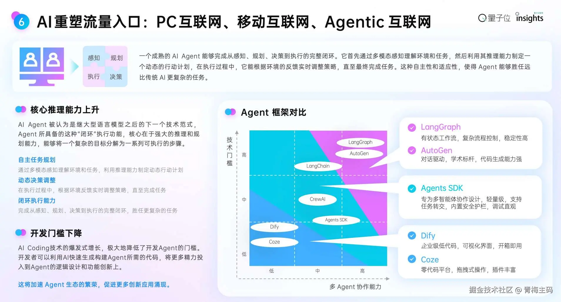 Agent 是下一个范式,能感知-规划-执行闭环。核心是推理能力,分解复杂任务。开发门槛降了,AI 编码生成代码,框架如LangGraph (状态工作流)和AutoGen (对话驱动)让构建Agent 如搭积木。流量从"人找服务"变"服务找人",对话即入口,操作系统或成超级Agent 。2025年,专业Agent 将取代部分App。