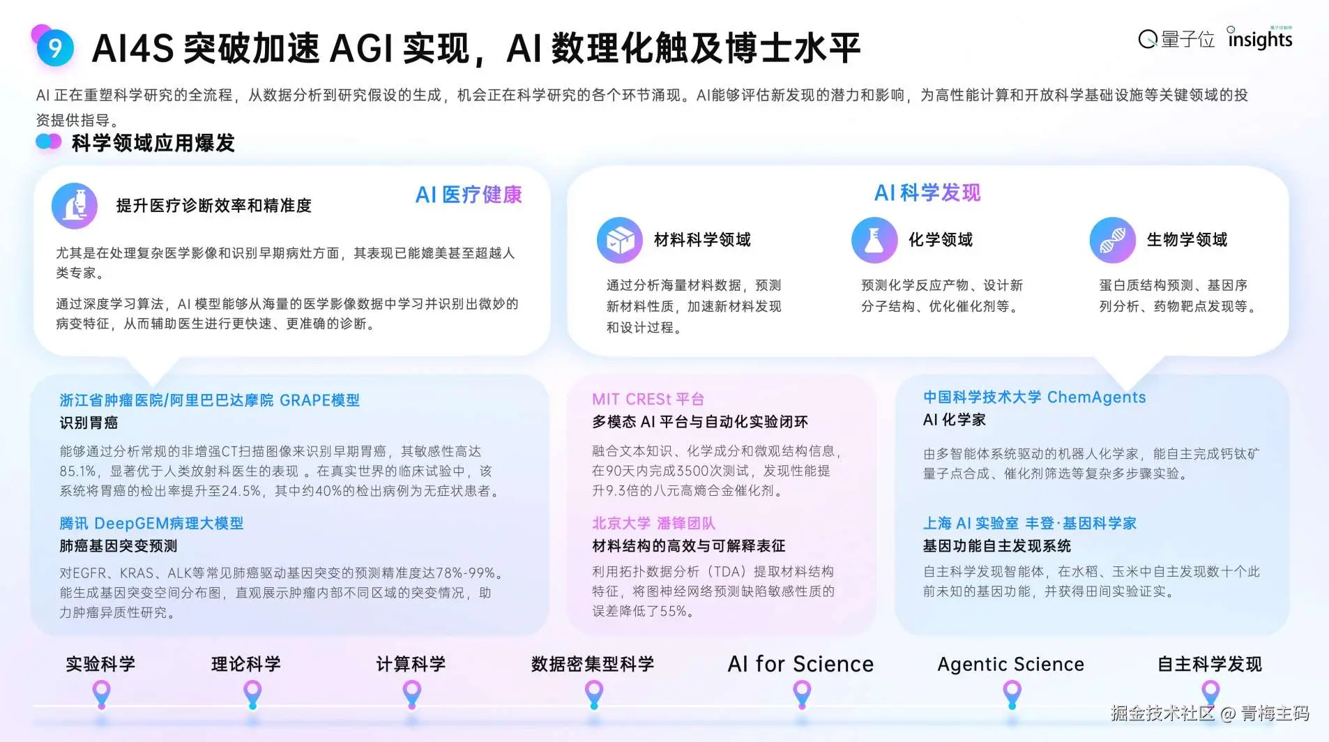 AI for Science (AI4S )重塑科研全流程。医疗如GRAPE 模型识胃癌敏感性85.1% ,DeepGEM 预测肺癌基因78%-99%精准。材料科学发现高熵合金催化剂性能升9.3倍 ,ChemAgents 自主合成量子点。Agentic Science 让AI 成"化学家",加速AGI,触及博士级数理化能力。