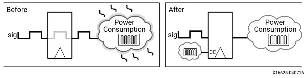 1)工具充分利用设计中的时钟使能资源,构建门控逻辑驱动寄存器时钟使能端。该机制确保寄存器仅在数据捕获周期工作,避免无效时钟周期消耗。需要注意的是,在实际芯片中,CE通过切断非必要时钟信号实现门控功能,而非在触发器D/Q端进行选择。这种实现方式既提升了CE输入性能,又有效降低了时钟相关功耗。