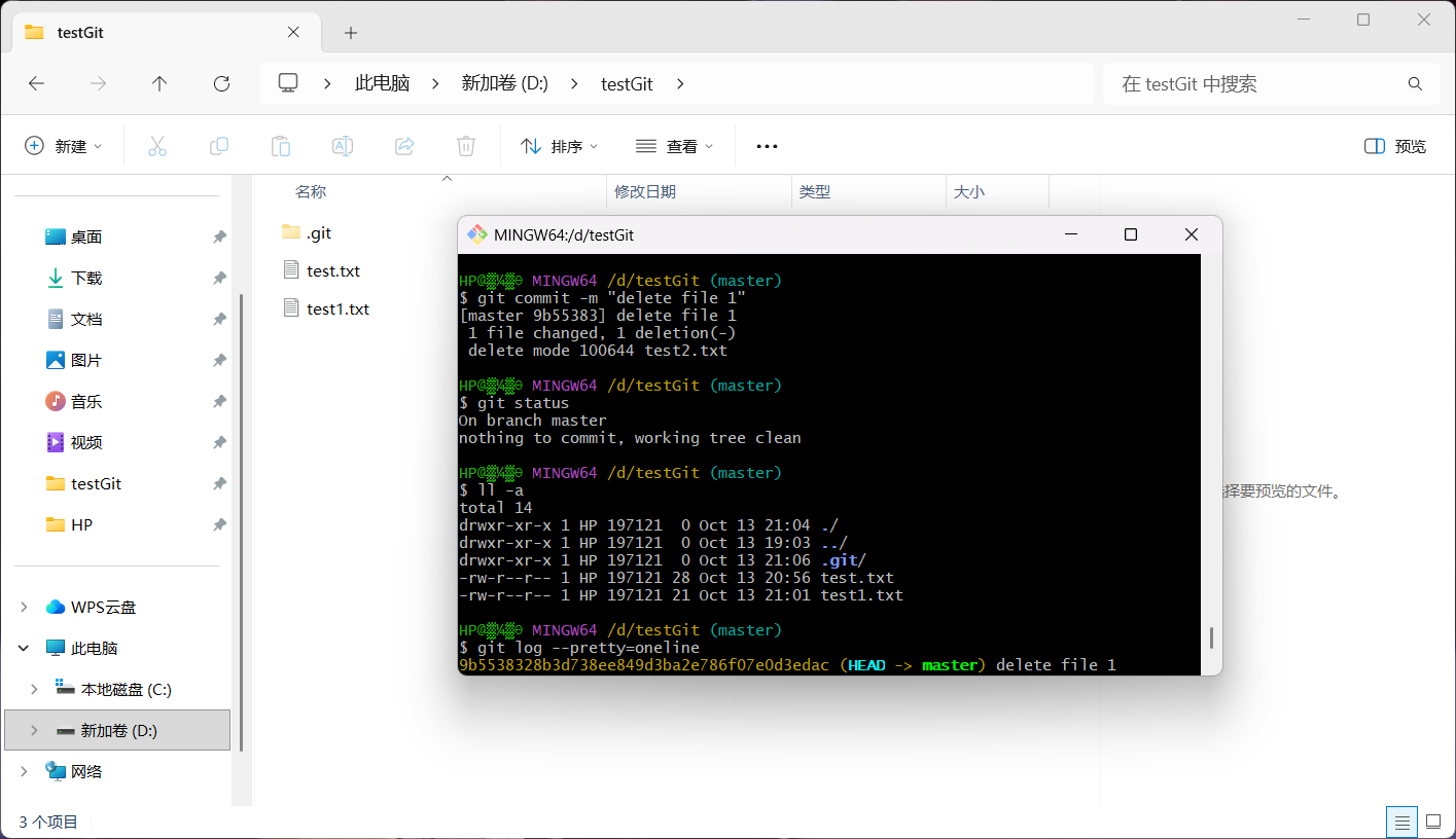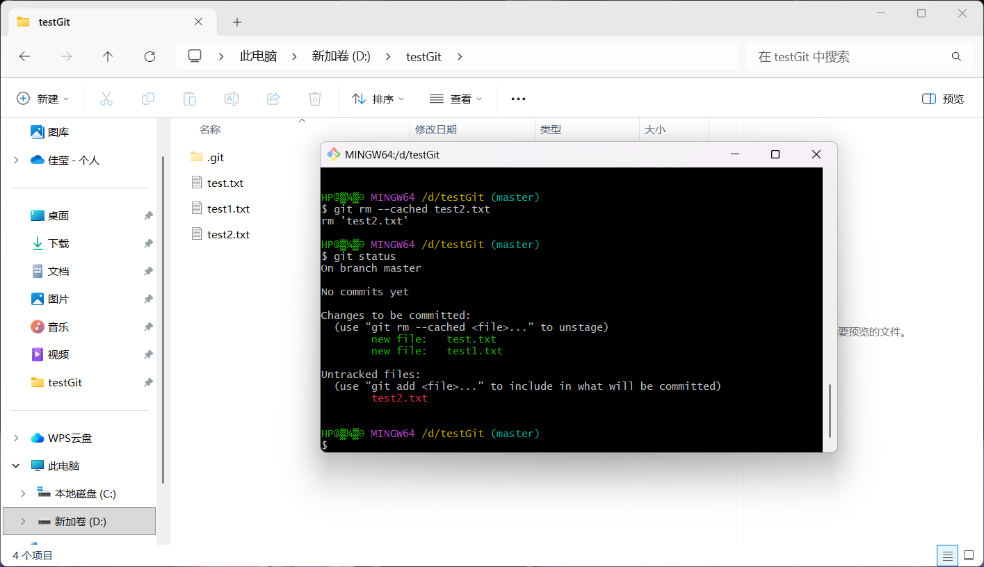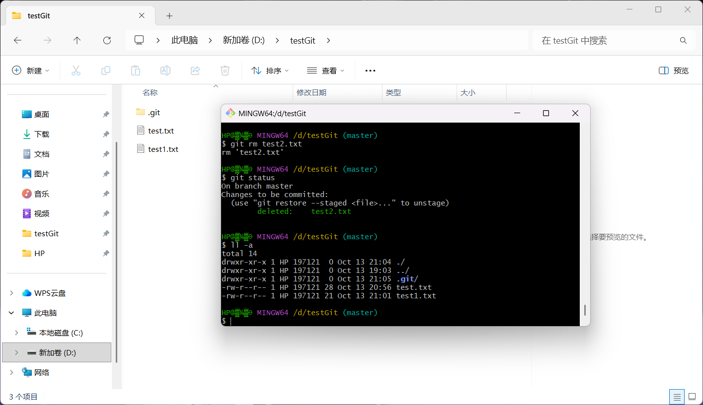 删除文件命令 git rm test2.txt,发现文件直接进入暂存区