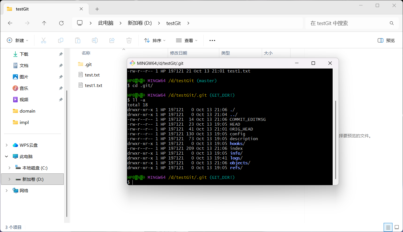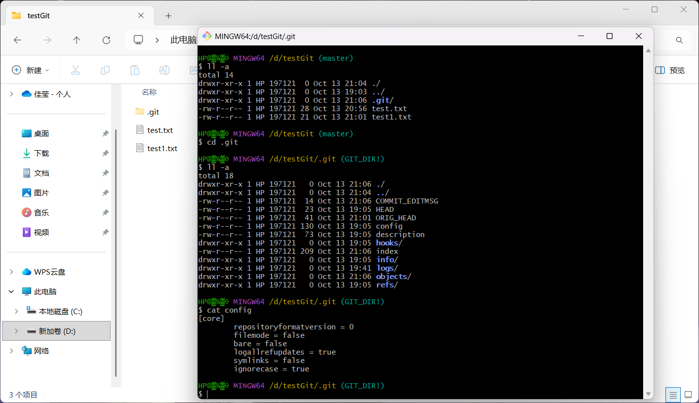 这时候当前testgit目录下会多了一个.git的目录,这个目录是Git来跟踪管理版本的,.git里面内容如下: