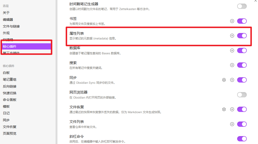 。进入 设置 > 核心插件。打开属性列表