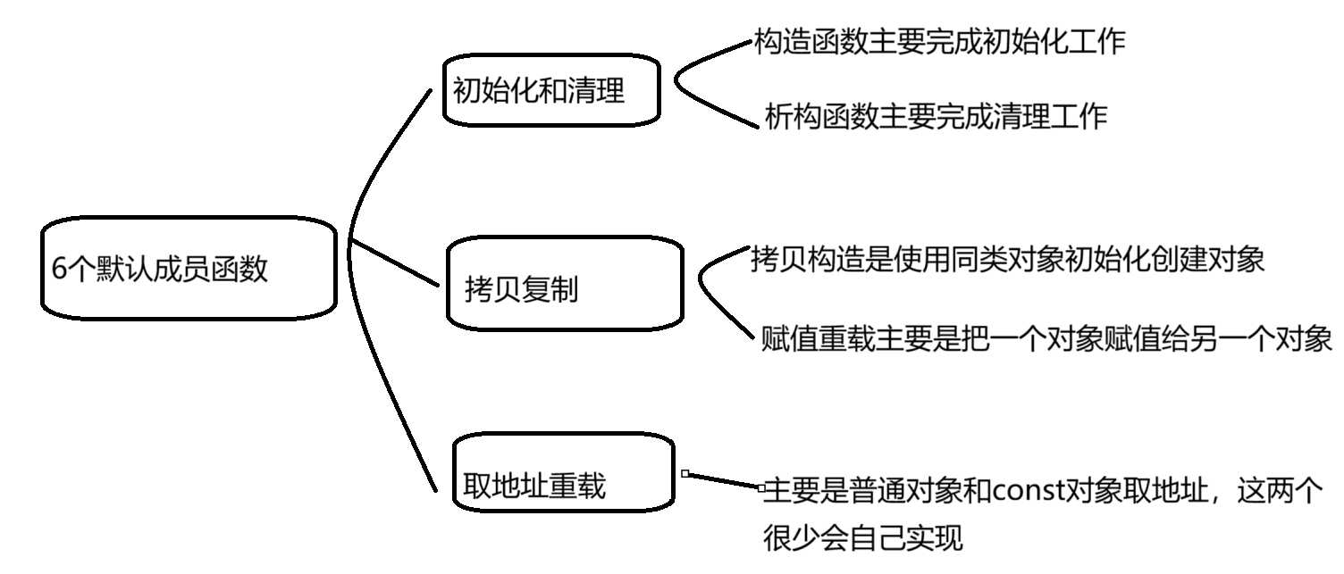 默认成员函数就是用户没有显示实现,编译器会自动生成的成员函数称为默认成员函数。一个类,在我们不写的情况下编译器会默认生成一下6个默认成员函数,前4个较为重要C++11后还增加了移动构造和移动赋值。必须要有两点思路: