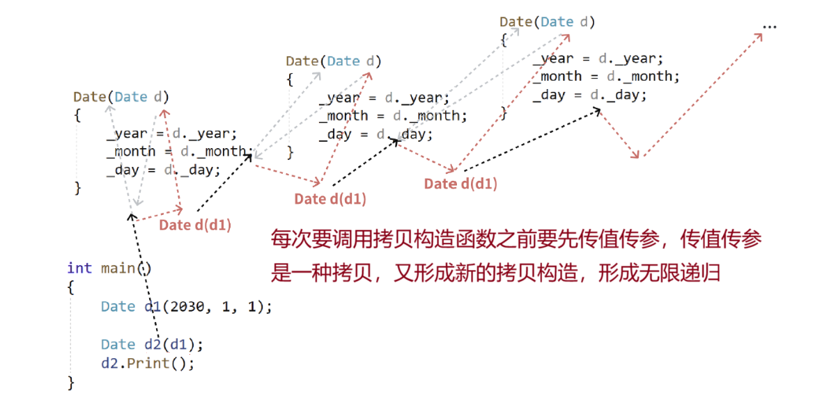 2.拷贝构造函数的第一个参数必须是类类型对象的引用,使用传值方式编译器直接报错,因为语法逻辑上会引发无穷递归。拷贝构造函数也可以多个参数,但是第一个参数必须是类类型对象的引用,后面的参数必须有缺省值